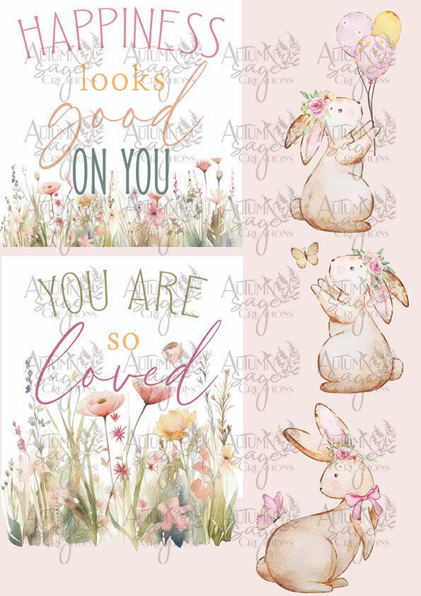 Soft hues of happiness in this multi project paper with wildflowers & bunnies! Printed on Autumn Sage Creations hemp decoupage paper.