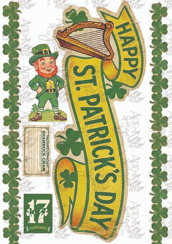 Vintage St. Patty's Day with a lucky litte leperchan and signage ! Printed on Autumn Sage Creations hemp decoupage Paper.